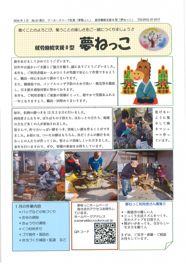 私たちワーカーズコープ佐賀夢根っこは、共に生き、共に働く社会をめざし、一人ひとりの生活と人生を受け止め合える関係をつくることを目的としています。