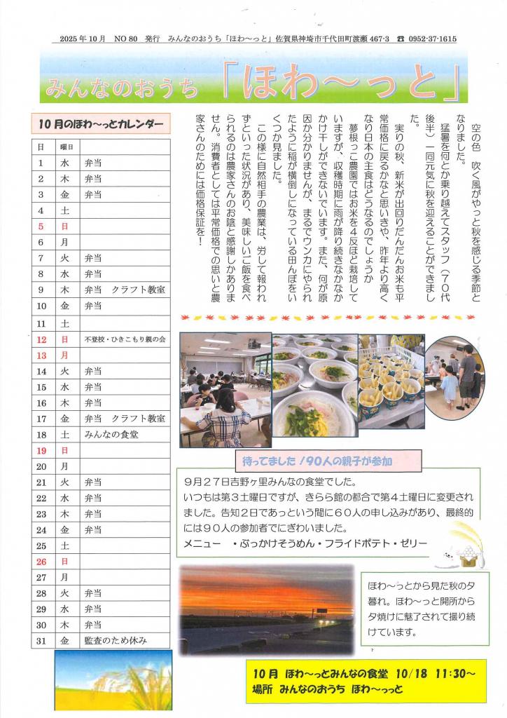 「障がいがあるなしに関わらず、親子の居場 所・相談できる場所・学ぶ場所が必要!そし て障がい児がいても働ける環境が欲しい! 生まれたこの地域でいろいろな人たちと繋 がり暮らすことが親にとっての安心。この町 が障がい児・者を受け入れてくれることは、 すべての人たちに優しい町になると思う」の 声が形になったのが「ほわ~っと」です。 新たな出会いを求めて訪れる人、疲れた心を 癒しに来る人、ほわ~っとしたこの場所で何かが始まるかもしれません!